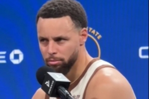 賽后,庫里接受媒體采訪期間記者手機鈴聲響了,庫里隨即跟隨音樂開始扭動身體。