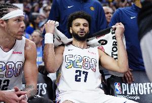 賽前,掘金官方更新了球隊的傷病情況,小哈達(dá)威(膝蓋傷勢)、阿隆·戈登(腿筋傷勢)和賈馬爾·穆雷(膝傷、生?。┍緢龆寄艹鰬?zhàn)!