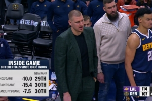 約老師缺陣后 掘金場均籃板減少10個 場均內(nèi)線得分減少15.4分 場均二次進攻得分減少7.5分