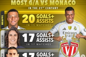 據(jù)統(tǒng)計(jì),姆巴佩在面對老東家摩納哥的15場比賽中已經(jīng)直接參與20球,在21世紀(jì)對陣摩納哥參與進(jìn)球(進(jìn)球+助攻)榜上位居第一,具體榜單如下: