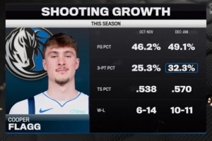 “我認(rèn)為你知道他在賽季初期承擔(dān)了很多,既要打控球后衛(wèi),又要努力給每個人傳球,而最近幾個月,他已經(jīng)適應(yīng)多了,他打得更加自如了,”諾維茨基說,“我會說他現(xiàn)在投籃時更加自信了,并不是說他改變了投籃姿勢或技巧,只是帶著更多信心去出手。自從更多回到他熟悉的位置后,他的節(jié)奏非常好,場均大概26分5籃板,命中率接近50%,他最近的投籃效率非常高。”