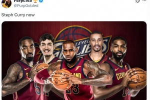 湖人自媒體???????????????? ??曬出了詹姆斯當(dāng)年率領(lǐng)的騎士五人組(詹姆斯、JR·史密斯、奧斯曼、喬治·希爾、TT)并評(píng)論道:“這就是庫里現(xiàn)狀。”