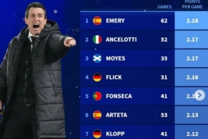 體育資訊1月23日訊 本賽季維拉在歐聯(lián)杯表現(xiàn)出色,7戰(zhàn)6勝1負,德轉也盤點了自2020年以來各位主帥在歐戰(zhàn)場均積分榜,其中埃梅里居首,具體如下(至少執(zhí)教30場比賽):