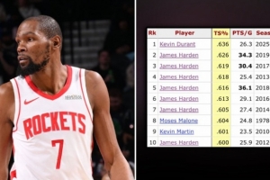 本場(chǎng)比賽過后,杜蘭特場(chǎng)均26.3分,真實(shí)命中率63.6%,創(chuàng)火箭隊(duì)史場(chǎng)均20+球員中真實(shí)命中率歷史新高。