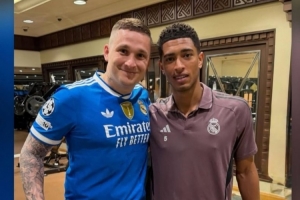一位來(lái)自波蘭的皇馬球迷與貝林厄姆合影,并展示腿上的貝林厄姆頭像文身,貝林厄姆社媒轉(zhuǎn)發(fā)了合照。