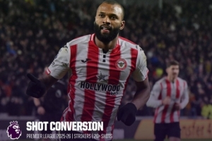 體育資訊1月25日訊 數(shù)據(jù)網(wǎng)站OPTA盤點了本賽季英超球員射門轉(zhuǎn)化率榜單,具體如下(至少20次射門):