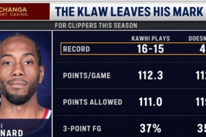 在倫納德缺席的比賽中,快船戰(zhàn)績4勝9負,場均得分112.5分,場均失分119.5分,球隊三分命中率35%。