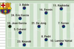 體育資訊1月11日訊 北京時間明天凌晨,巴薩將在西超杯決賽中對陣皇馬,《阿斯報》預(yù)測了巴薩此役的首發(fā)陣容。
