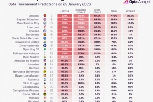 體育資訊1月30日訊 歐冠聯(lián)賽階段已經(jīng)結(jié)束了全部爭奪,除了已經(jīng)被淘汰的8支球隊外,OPTA對剩余球隊的奪冠概率進行了預測,阿森納以29.8%居首,拜仁以14.9%位居次席。