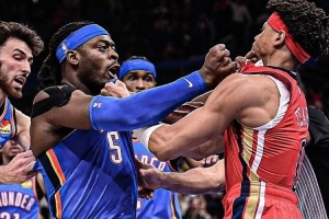 雷霆和鵜鶘的比賽最后時刻,場上卻突然發(fā)生沖突:站在戰(zhàn)場中央的兩位,一個是全聯(lián)盟頂級惡人多爾特,而另一位,卻是一個比他足足輕了30斤的新秀,杰里米亞-費爾斯。