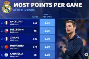 體育資訊1月13日訊 皇馬已經(jīng)官宣解雇哈維·阿隆索,《轉會市場》統(tǒng)計顯示后者位列皇馬隊史拿分榜第7位。
