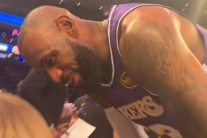 在這段花絮中,詹姆斯在賽前笑容滿面地俯身親吻了妻子薩瓦娜,并稱呼妻子為“寶貝”。