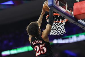 首節(jié)比拼,巴洛助76人占據(jù)主動。他打滿12分鐘,7投4中,罰球3中3,得11分7板1助1斷1蓋帽,前場籃板有4個。