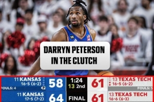 比賽最后時刻,堪薩斯大學(xué)打出一波17-4的攻擊波完成大逆轉(zhuǎn),彼得森最后投中了兩記高難度三分,包括準(zhǔn)絕殺的三分。