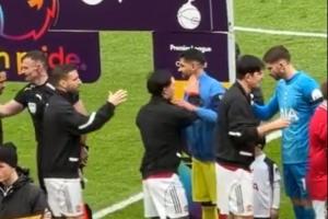 曼聯(lián)vs熱刺賽前,兩位阿根廷的隊友互相調(diào)侃,羅梅羅握手環(huán)節(jié)摸利馬的臉,結果被后者回了一巴掌。