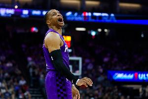 上半場比拼,威少出戰(zhàn)16分鐘,6投5中,三分3中3,罰球2中0,得13分3板4助。