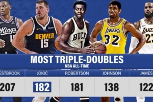在本場(chǎng)比賽中,約基奇拿到生涯第182次三雙,超越奧斯卡·羅伯特森,上升至NBA歷史第二。