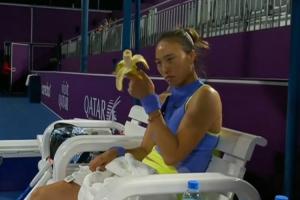 比賽期間,鄭欽文在場邊補給時,發(fā)現(xiàn)香蕉上有螞蟻,她彈掉螞蟻后端詳再三,接著把香蕉吃了。