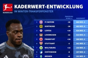 德甲球隊(duì)冬窗之后身價(jià)排名: