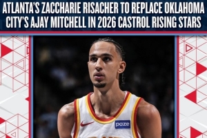 體育資訊2月11日訊 NBA官方宣布,24年?duì)钤憷销椙颁h里薩謝將頂替雷霆后衛(wèi)阿杰伊·米切爾,加入特麥迪執(zhí)教的Team T-Mac,出戰(zhàn)2026年全明星新秀挑戰(zhàn)賽。