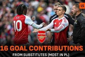 本賽季,阿森納替補(bǔ)球員在英超參與了16個進(jìn)球,在聯(lián)賽排名第一,而曼城的替補(bǔ)球員只參與2個進(jìn)球,聯(lián)賽最少。