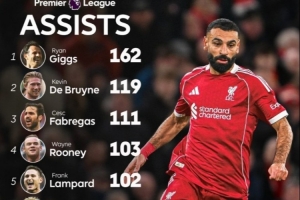 英超歷史助攻榜:薩拉赫93次追平大衛(wèi)·席爾瓦,并列第七