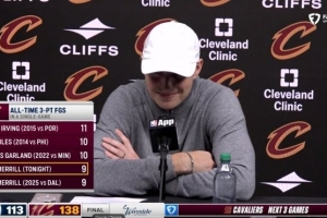 據(jù)統(tǒng)計,梅里爾單場9記三分,追平了自己保持的騎士隊史單場第4高三分命中紀錄,僅次于歐文(11記)、CJ·邁爾斯和加蘭(10記)。