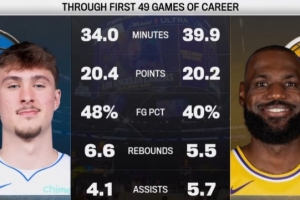 不遑多讓!生涯前49場(chǎng)弗拉格場(chǎng)均20.4分6.6板 詹姆斯20.2分5.7助