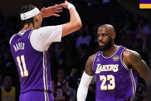 湖人官方曬贏球海報:詹姆斯與海斯慶祝畫面登上封面