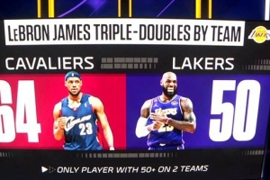 詹姆斯生涯在兩支球隊(duì)拿到50次三雙(騎士64次),歷史唯一。
