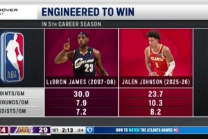 老鷹客場挑戰(zhàn)湖人,轉(zhuǎn)播方曬出杰倫·約翰遜和詹姆斯生涯第五個賽季的數(shù)據(jù)對比,老鷹官推轉(zhuǎn)發(fā)。