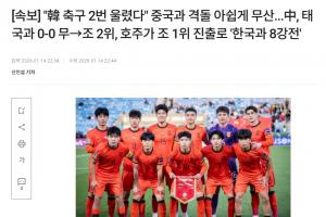 韓媒標(biāo)題為:韓國(guó)足球兩度飲恨,與中國(guó)對(duì)決遺憾落空(中國(guó)0-0戰(zhàn)平泰國(guó)獲小組第二,澳大利亞頭名晉級(jí)將與韓國(guó)會(huì)師)