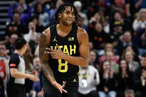 上半場,爵士球員森薩博狀態(tài)火熱,首節(jié)就拿下21分,半場不到就刷新賽季新高,在15分鐘的時間里,投籃13中10,三分球6中4,罰球4中4,轟下28分1籃板2搶斷的數(shù)據(jù)。