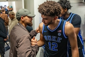 賽后戴爾·庫(kù)里、斯蒂芬·庫(kù)里、賽斯·庫(kù)里父子三人到訪了杜克的更衣室,而作為校友的賽斯見到這群學(xué)弟們也非常開心。