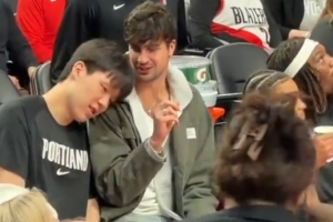 此役,楊瀚森未能獲得出場機會,場邊與同樣缺陣的阿夫迪亞有說有笑,還靠了下對方的肩膀。