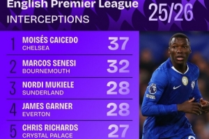 本賽季英超成功攔截榜: