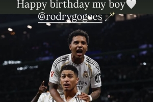 體育資訊1月10日訊 皇馬邊鋒羅德里戈在今日迎來(lái)了25歲生日,他的隊(duì)友貝林厄姆也通過社媒送上祝福。