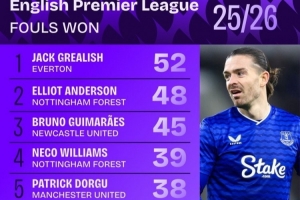 體育資訊1月10日訊 數(shù)據(jù)機構squawka統(tǒng)計了本賽季英超的造犯規(guī)情況,格拉利什居首。