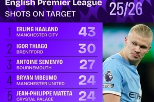 體育資訊1月10日訊 數(shù)據(jù)機(jī)構(gòu)squawka統(tǒng)計(jì)了本賽季英超射正情況,哈蘭德居首。