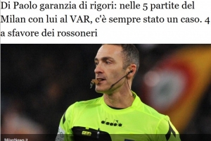 一項引人關注的統(tǒng)計數(shù)據(jù),在本賽季由迪保羅作為VAR裁判執(zhí)法的米蘭比賽中,總是會出現(xiàn)點球判罰。