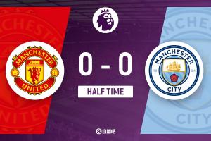 上半場(chǎng)比賽結(jié)束,曼聯(lián)0-0曼城。