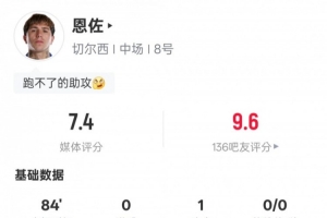 體育資訊1月18日訊 2025-26賽季英超聯(lián)賽第22輪,切爾西主場(chǎng)迎戰(zhàn)布倫特福德。恩佐首發(fā)出戰(zhàn),送出1次助攻,還有2次過(guò)人成功和3次關(guān)鍵傳球,評(píng)分7.4。
