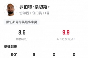 體育資訊1月18日訊 英超第22輪,切爾西2-0布倫特福德。本場(chǎng)比賽,藍(lán)軍首發(fā)門將羅伯特·桑切斯表現(xiàn)出色,貢獻(xiàn)全場(chǎng)最多的6次撲救,評(píng)分8.6全場(chǎng)最高。