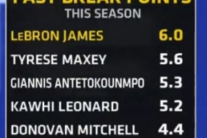 湖人VS開(kāi)拓者,轉(zhuǎn)播方曬出本賽季快攻場(chǎng)均得分前五: