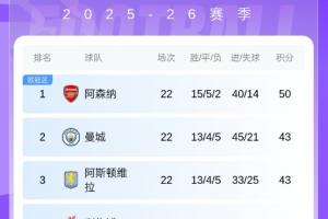 但因本輪排名第2的曼城和排名第2的維拉均吞敗仗,曼城0-2輸?shù)袈械卤?,維拉主場0-1不敵埃弗頓,阿森納仍成功擴大分差。從上一輪的6分領(lǐng)先擴大至7分領(lǐng)先!