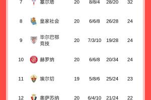西甲積分榜完整形勢如圖所示: