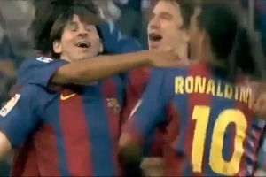 當時巴薩主場2-0擊敗對手,埃托奧破門,身穿30號的17歲小將梅西替補登場,在最后時刻接小羅助攻打進一線隊首球。隨后兩人跑到場邊慶祝,小羅彎下腰,梅西跳到大哥背上慶祝的畫面也成為了足壇最經(jīng)典的畫面之一。