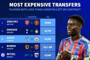 體育資訊1月20日訊 曼城已經(jīng)官宣引進水晶宮中衛(wèi)格伊,《轉(zhuǎn)會市場》統(tǒng)計顯示他也是合同僅剩不到半年情況下的歷史第3貴球員。